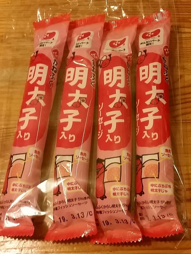 大洗町の観光名所。 明太子好きにはたまらない、 めんたいパーク。 今回は、明太子入りソーセージを購入しました。 やはり明太子が入るとすべてが美味しい。