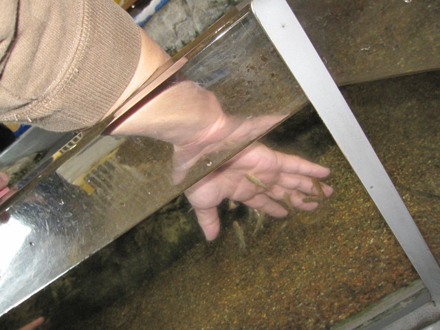 水族館といえば、派手なイルカショーに主役をもっていかれがちですが、まだあります!いちおしコーナー!!その名も「タッチングプール」。通称ドクターフィッシュと呼ばれる人の角質を食べることで有名な魚のいる水槽に手を入れることができます。通常は藻類やプランクトンをエサとしているそうですが、皮膚をついばむ際の刺激が代謝を促進させる「自然のピーリング効果」があることからそう呼ばれているそうです。水族館でキレイになれるかもしれませんよ。