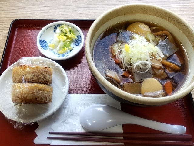 道の駅奥久慈だいご 大子町にきたので道の駅でお昼。 奥久慈しゃもや常陸秋そばなど 有名食材が多数あるので迷うが ◆けんちんそば850円 ◆手作り焼きおにぎり100円 けんちんはやさしい味付けと 野菜がごろごろ。 そばも美味しく、これは外せません。
