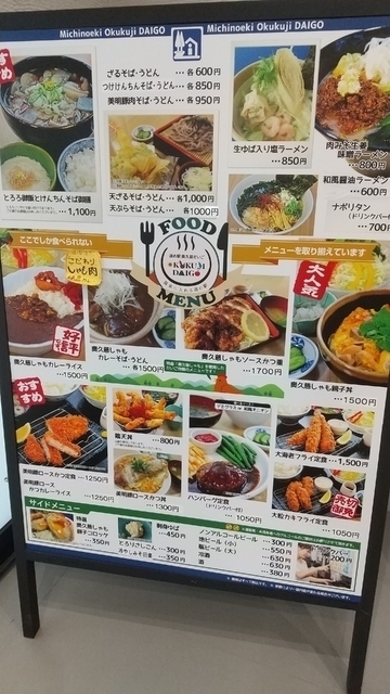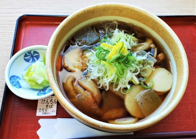 《けんちんそば》850円 レストランでけんちんそばをいただきました。 黒いそばで、ほのかにゆずの香りがして、おいしかったです。 奥久慈しゃもを使ったメニューがおすすめのようです。 しゃもカレーや親子丼(いずれも1,500円)などがありました。