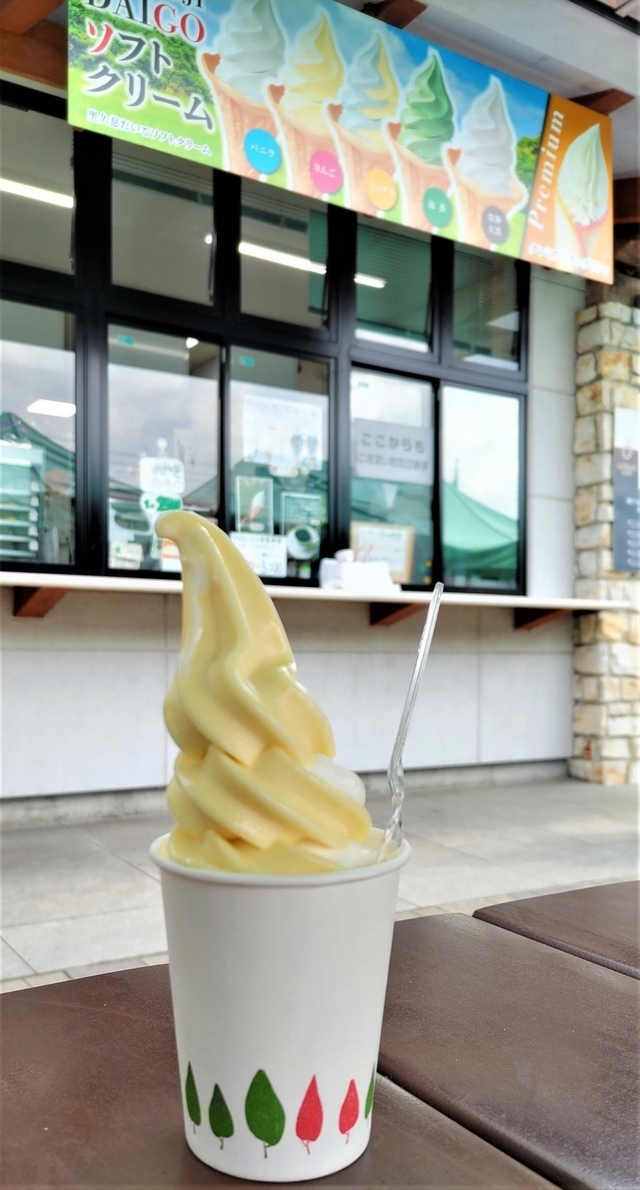 【りんごソフト・ミックス】350円 大子町はりんごや奥久慈茶、常陸大黒で知られていて、それらを使ったソフトクリームを味わうことができます。しかし、この時期味わうことができるのは、りんごとバニラのみです。 今回はカップでミックスをいただきましたが、コーンもあります。