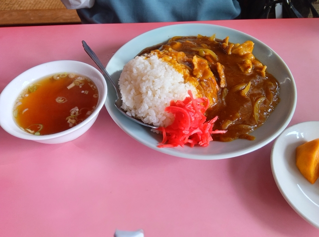 久しぶりに来たら新メニューが。 攻める嫁さんは新メニューのカレー中華丼、私は迷ったあげく安定の肉そば。 見た目は普通の豚肉たくさん入ったカレーです。食べてみると餡が強めのカレー。中華? 美味しいけど??一番中華丼らしいのは添えられた紅しょうが(笑)