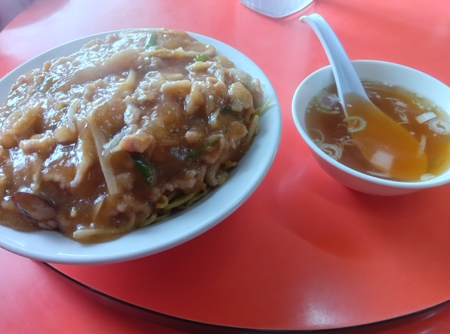 今回は肉掛け焼きそばを食べました。 肉掛けそばの餡を焼きそばに掛けたものです。 焼きそばがちょっと焦げた感じですがボリュームたっぷりで美味しかったです。