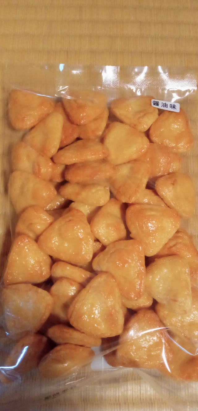 一口サイズの三角形のおせんべいを購入しました。定番の醤油味で、とても美味しいです。ついつい手が止まりません。オススメです!!