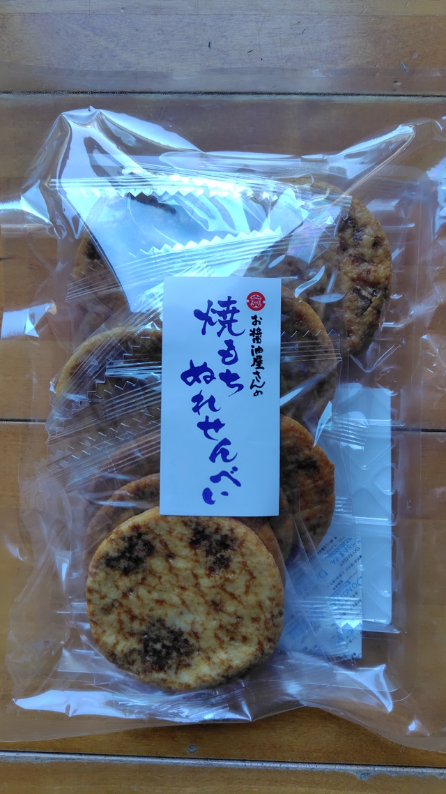 こちらの看板せんべい「焼きもちぬれせんべい」を購入しました。食感が楽しめるぬれせんべいです。ついもう一枚と手が止まりません。オススメです!!