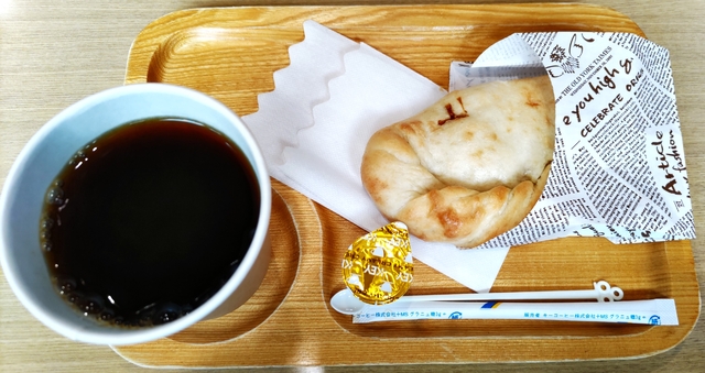 【包み焼きピザセット】 包み焼きピザやキッシュなどの軽食を提供していたので、包み焼きピザとコーヒーをいただきました。ピザとコーヒーのセットで550円。(単品注文だと各300円) ピザはちょっと小腹を満たすほどの大きさなので、おやつにちょうどいいという感じです。 (HPに掲載されているチーズピザのメニューはありませんでした。)