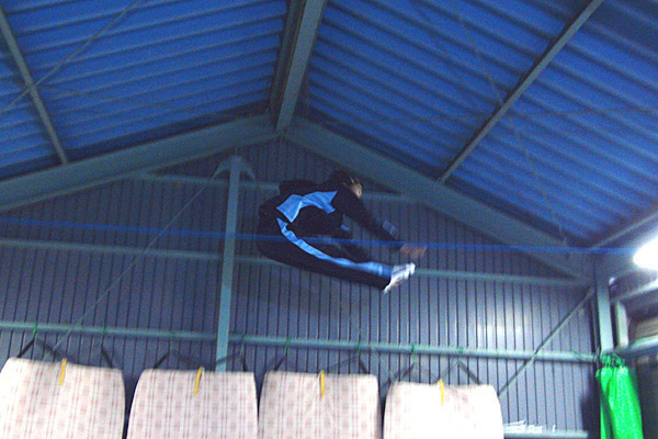 トランポリンを使って、空中でいろいろな運動を行います。