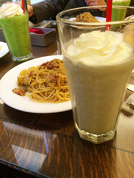 パスタにサラダと大きなスムージーまでついて950円のランチ。カルボナーラは店員さんがこしょうをかけてくれるのですが、多めにたっぷりかけてもらうのがお気に入り。
