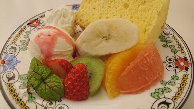 明太子としめじのパスタたべましたー!美味しかった! ドリンク+ケーキのセットにしたのですが、苺のスムージーもとてもおすすめです。ケーキは毎回同じなのかはわからないのですが、今回出てきたのはシフォンケーキでした。それもすごく美味しかったです。
