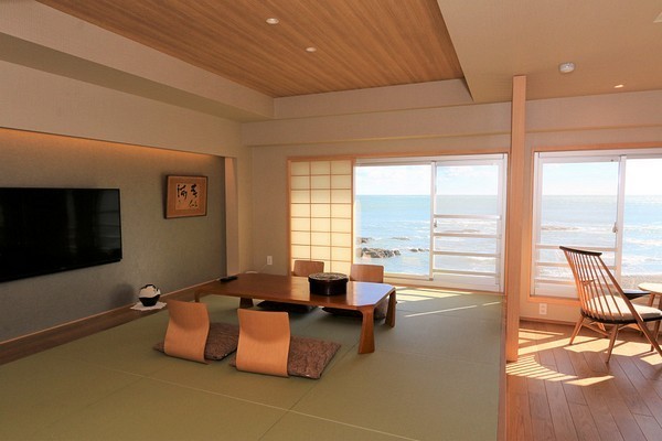 当館は大洗海岸の中央に位置し、お部屋からは大洗の海が一望できます。
