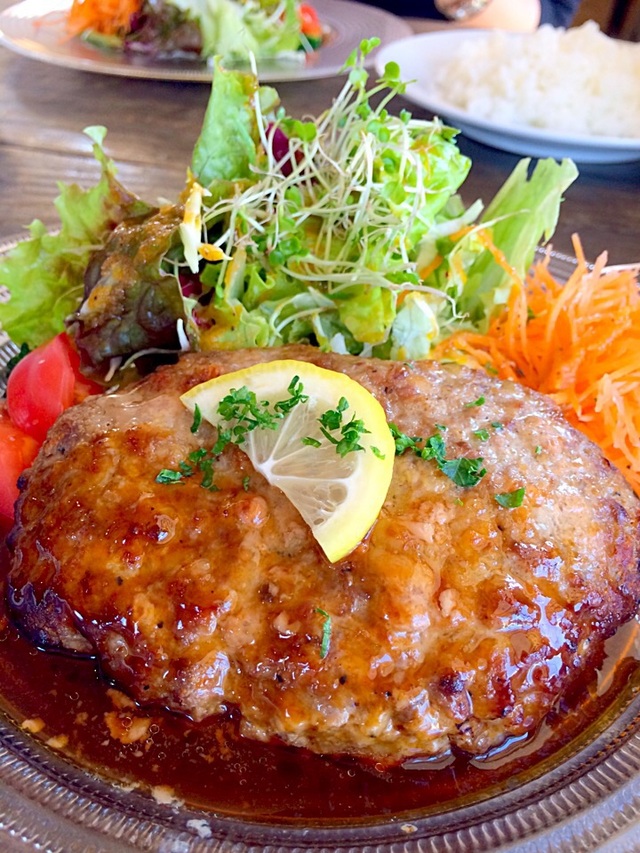 レアレアハンバーグ食べました♡ホントに中が生肉!って感じで大丈夫かな~?と思いましたが臭みも全然なくお肉の旨味が最高でした♪とても食べやすかったです。タレもほどよくニンニクが効いていて美味しかったです。サラダはシーザーサラダにしましたが、チーズがたくさん乗っていてすごく良かったです~オススメ(^^)