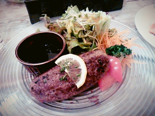 おすすめの常陸牛のレアハンバーグを食べました。 そのままでもとってもおいしくってふわふわでお箸ですっときれます♪ お好みの感じに焼いて食べれます。 サラダは、+料金でシーザーサラダに変更できます。 おいしかったのでまた来たいです。