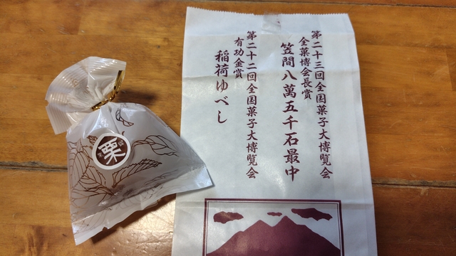 栗のお菓子を購入しました。 笠間稲荷神社に伺った際にはいつも購入しています。 ゆべしも購入しました。 とても喜ばれます。