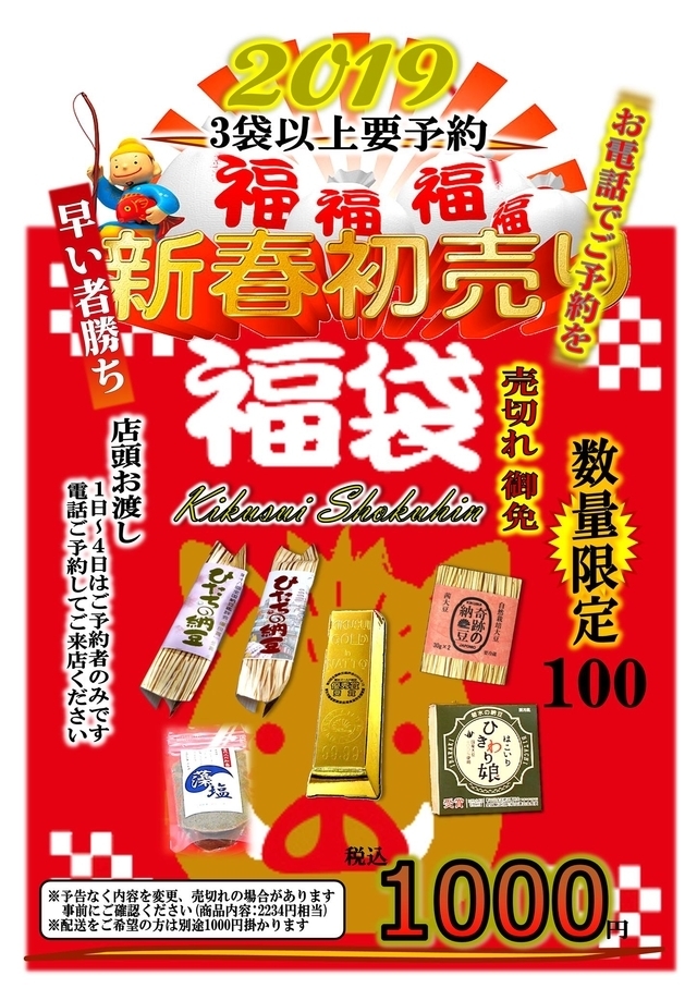 茨城県のお土産といえば「納豆」 日立市の老舗納豆屋の菊水食品が今年も福袋を販売します。 セット内容は、2200円以上の商品が入って、税込価格1000円で販売します。 予約販売が12月25日から始まっています。 限定100袋の販売です。限定数になった時点で販売を中止する予定です。 お早めにお買い求めください。