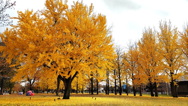【黄色い絨毯】 いちょう並木を見上げると、葉が結構落ちて枝の部分が多く見えていましたが、道や芝生はたくさんの落ち葉で黄色一色。なかなかきれいな風景でした。 並木道脇の芝生の中に、1本の大銀杏。枝葉が多くみごとでした。