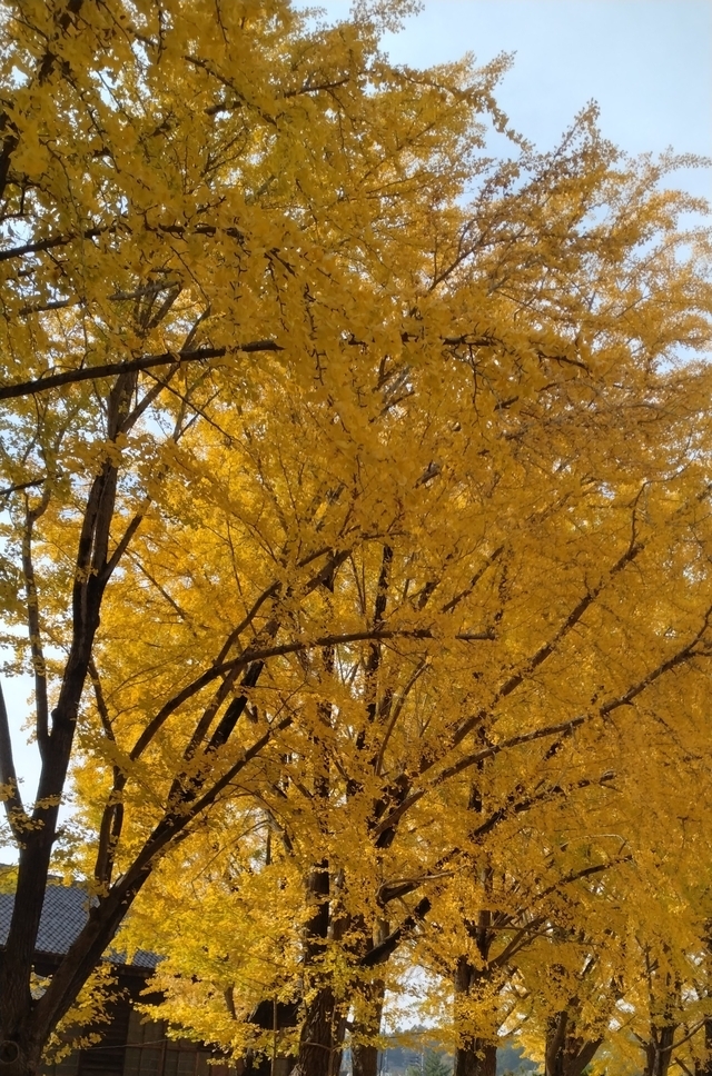 【黄色い絨毯】 いちょう並木を見上げると、葉が結構落ちて枝の部分が多く見えていましたが、道や芝生はたくさんの落ち葉で黄色一色。なかなかきれいな風景でした。 並木道脇の芝生の中に、1本の大銀杏。枝葉が多くみごとでした。