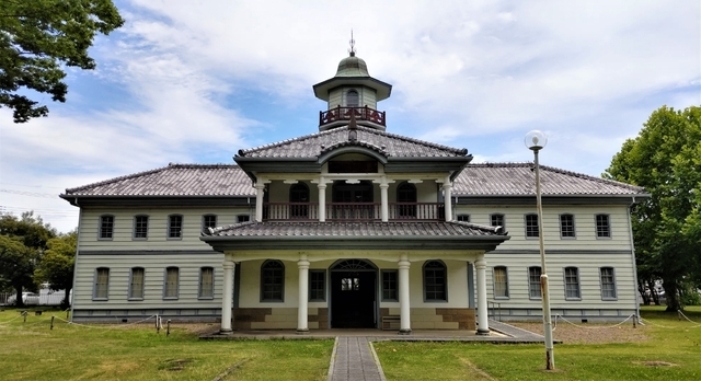 【旧水海道小学校本館】 歴史館の庭園は無料で散策することができます。(駐車場も無料。) 広い庭園の中には建造物等見どころが何カ所かあります。その中で、入場して見学できるところが、洋風建築の旧水海道小学校本館です。現在見学できるところは1階の3部屋のみで、ピアノ展示室や2階は見学不可となっています。 その1階には、昔の教室を再現した中に、昔と現在の給食のサンプルが展示してありました。ある年代以上の人にとっては懐かしく感じられると思います。 このような洋風建築の学校は素敵だなと感じました。