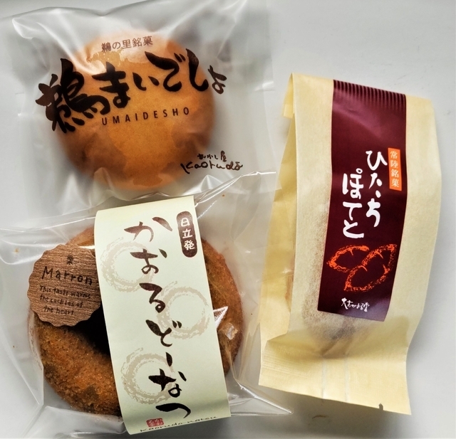 人気のお菓子を購入してみました。 【ひたちポテト120円】さつまいも餡の焼菓子。人気No.1の和菓子。 【鵜まいでしょ110円】ミルク饅頭のような和菓子。日立市地域ブランド認定品で、人気No.2。 【かおるどーなつ・栗220円】プレーン、抹茶、チョコなど5種類あり、その中で栗は人気No.1。 人気のお菓子は、地元のスーパー、マルト川尻店にも置いてありました。ただ、かおるどーなつの栗はありませんでした。