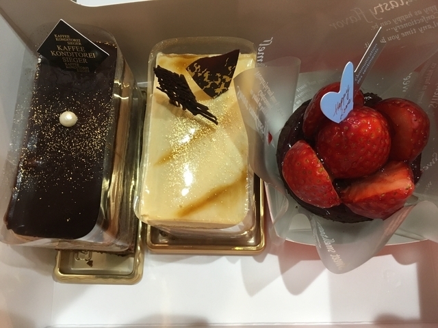 3種類のケーキを購入しました。チョコレートは口どけがよく滑らかでまったりして濃厚でおいしかったです。見た目もおしゃれな感じでした。
