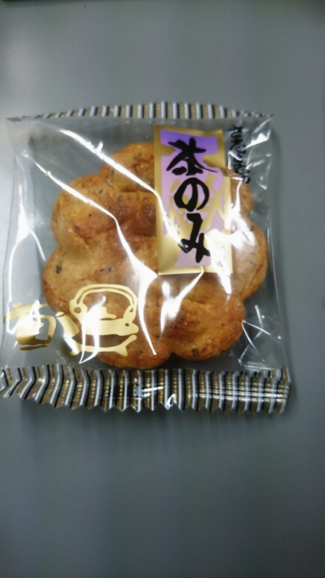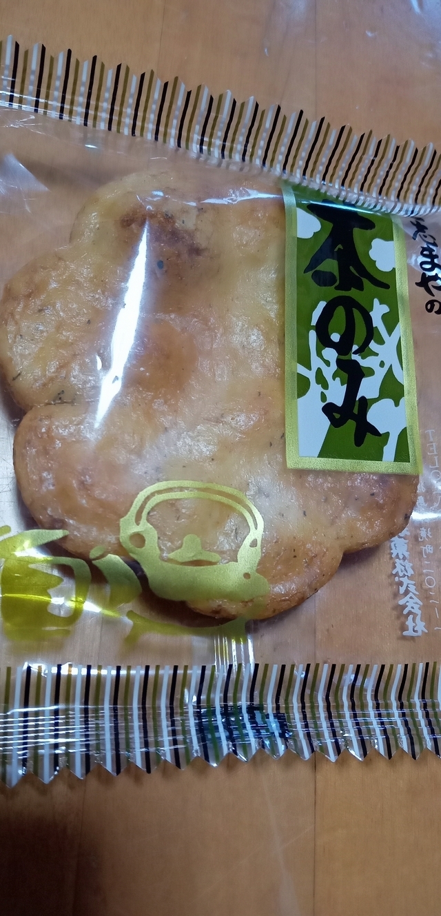 今回は青ノリがまぶしてある「茶のみ」というおせんべいをいただきました。 ネーミングのとおりお茶にあうおせんべいで、特に熱いお茶と一緒にいただくと旨さ倍増です。