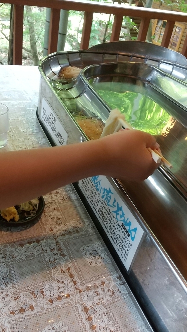 今年も流しそうめんを食べに来ました。 マナーの悪さから今年から水遊びは禁止になったそうです。 開店30分前に到着。入口前の並び客は無しなので嫁さんと息子に並んでもらって娘とカブトムシいないかブラブラして戻ると嫁さんと息子の前に三組ほどの待ち客がいる?? 聞くと先に来てその辺で座ってたり、遊んでた家族が自分たちが先に並んでたと主張したらしく嫁さんは大人の対応で譲ってあげたらしい。並ぶの意味が分かってない客もいるみたいのでこちらも注意書きが必要ですね。 流しそうめんはいつも通り美味しくまた楽しめました。 空飛ぶ流しそうめんだと昔ながらの一つのレーンなのでそうめんを誰が取るか、譲るか またトマトやアンズ、巨峰が流れて(転がって)くるのでいろいろ楽しめます。