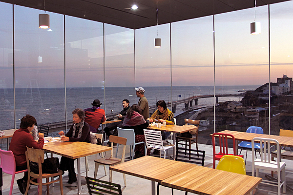 2011年12月10日、日立駅東口にオープンした、海の見えるガラス張りのカフェです。目の前は太平洋の大海原。まるで海に浮かんでいるようです!