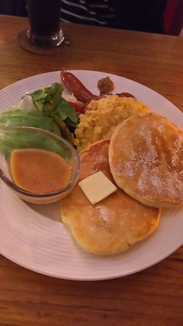 いつも甘いパンケーキなので今回はおすすめのパンケーキを食べました。ベーコンも乗っていてお惣菜系のパンケーキで美味しかったです。