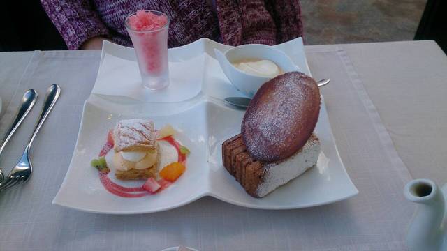 4種のデザートとモンブランを頂きました~ モンブランは甘さ控えめのフワフワ大人のケーキでさた! 4種のデザートは、名前わかりません(/_;) チョコケーキ、ブラマンジェ?、カスタードに生クリームをパイでサンドまわりにフルーツ!最後にいちごのシャーベットみたいなアイス!全体的に甘さのバランスが◎ とても美味しかったです!