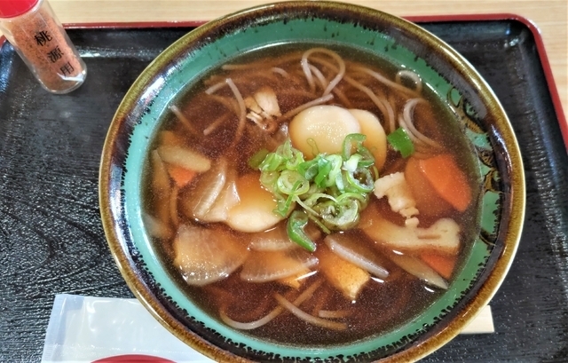 《けんちんそば 720円》 常陸秋そばを使った手打ちのそばをいただくことができます。 寒い時期なので、けんちんそばをいただきました。 けんちんの具はそれほど多くなく、大根、ニンジン、里芋、ごぼうなどです。そばはツルッとした感じです。 720円はそば屋さんの価格と比較すると安いですが、その分そば・具とも、量が少ないかなと感じました。ちなみにけんちんうどんもあります。