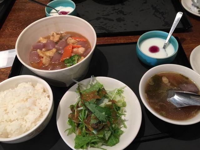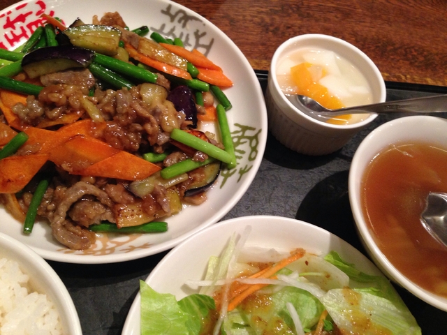 ランチに行きましたー!土曜日だったのでお客さんが多かったけど出てくるのも早かった!ランチメニューから茄子と牛肉炒めを注文。美味しかったです♪スープとサラダとデザート付いて850円はお得ー(OvO)