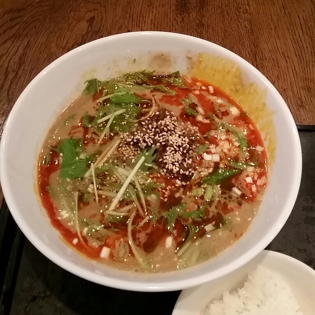 ●坦々麺セット 約5分で着丼。 見た目がきれいで美味しそう。 まずはスープ。ピリ辛でコクがあり美味しい。 麺は細麺でチョイ硬め。 挽肉もベストマッチで、見た目量が多い気がしたが、 あっという間に完食。 スープも最後まで飲み干せました。