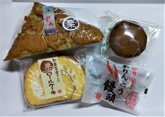 《和菓子屋さんのロールケーキ》210円 1カットのロールケーキは4種類ありました。 小倉、チョコ、ストロベリー、栗の中から、今回は栗を購入。 しっとりしたスポンジ生地に甘さ控えめのクリームと小さくカットされた栗が入っていました。 栗を使った蒸しパン(160円)もあったので購入しました。 栗はパンの中にちりばめられてはなく、上部表面にあるのみでした。 こちらも甘さ控えめです。蒸しパンも4種類ありました。 ピリ辛かりんとう饅頭(150円)とミニどら焼き(160円)も購入し、おいしくいただきました。