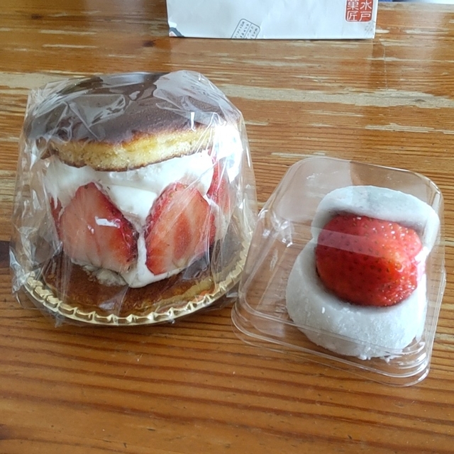 ◆季節のフルーツ生どら この時期は、大きな苺を使ったどら焼き。 ふわふわクリームと苺を生地で はさんだ、贅沢どら焼き。 ◆苺大福 こちらは定番の苺をはさんだ大福。 やわらくて美味しい和菓子。