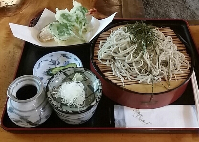 ◆海老天ざるそば1,000円 そばは、石臼でひいた手打ちの細麺。 常陸秋そばで、こしがあり、 香りの良い、美味しいそば。 自分好みです。 このそばを甘めのつけ汁で、 いただきます。 天ぷらもさくさくで、 海老、カボチャの味が引き立ちます。