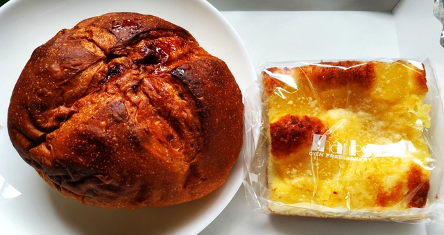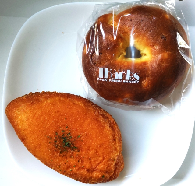 今回は、スパイシーカレーパン(200円)とオレンジとレモンのベーグル(210円)を購入しました。 スパイシーと商品名に付いていますが、それほど辛くはありません。中辛レベルかな。スパイシーと付かないカレーパンもありました。 オレンジとレモンのベーグルは、それぞれのピールが練り込まれていますが、オレンジの風味をより感じました。ベーグルも2種類あり、もう一つは「ごまベーグル」です。 どちらも温めておいしくいただきました。