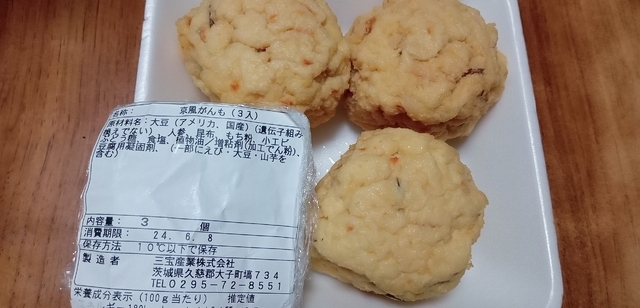「京風がんも」を購入しました。高野豆腐と一緒に白だしで煮物を作りました。この京風がんもは、にんじん・昆布入りで口当たりもよく、とても美味しくできました。オススメです!!