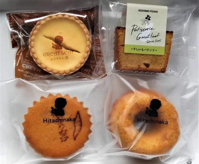 《干しいもスイーツ(焼菓子)》 ひたちなか市の特産物「干しいも」を使ったスイーツ(焼き菓子)があります。 購入したのは4種類。 「いもレーヌ」、「干しいも焼きドーナツ」、「干しいもパウンドケーキ」、「いもっぺ」。 いもレーヌは、「ひたちなか」の焼き印が入っています。 個人的におすすめは「いもっぺ」です。 タルト生地にほしいもを敷いて、ほしいも風味の生地を流し入れて焼き上げたもので、冷凍販売 されています。4種類の中で一番おいしかったです。