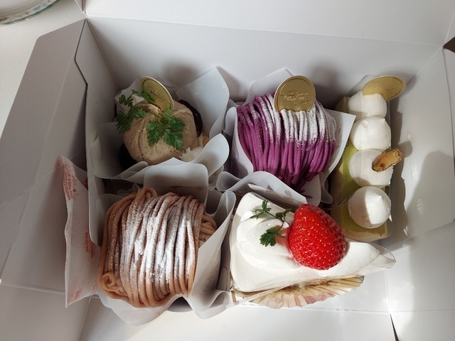 ショーケースにケーキと生ロールケーキがたくさん並んでいるので決めるのにも悩みます"(-""-)"どれもおいしそ~です。私が食べたのは紅芋のモンブラン。見た目もかわいくて紫芋のクリームがおいしかったです。焼き菓子もいろいろあるのでお土産にも喜ばれそうです。