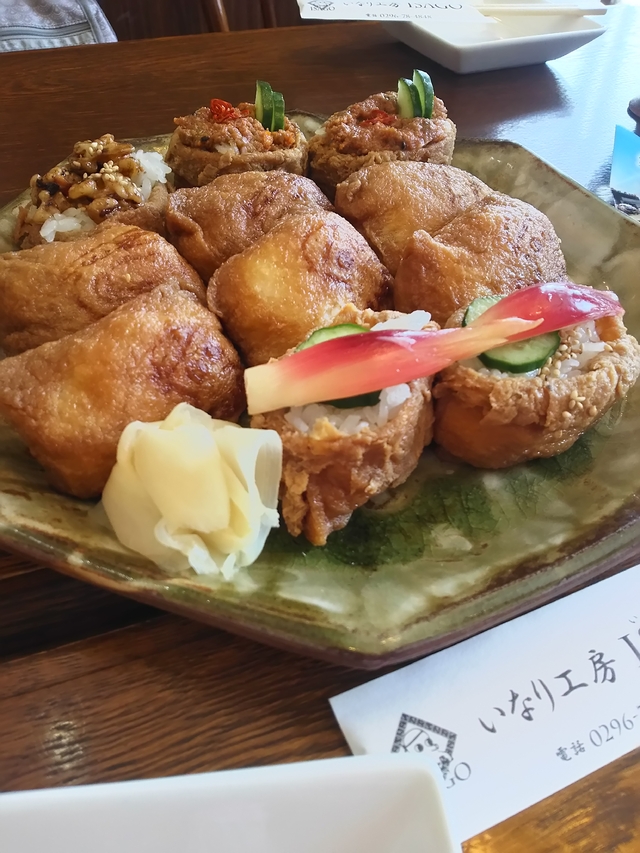ISAGOさんのいなり寿司は味がしっかりついています。笠間三大稲荷寿司は、帆立・蛸・海老のトッピングがのっている縁起の良いいなり寿司です。卵の太巻き寿司もボリュームがあるロールケーキのような巻き寿司です。月ごとに季節のいなり寿司もあるので買いに行くのが楽しみです。