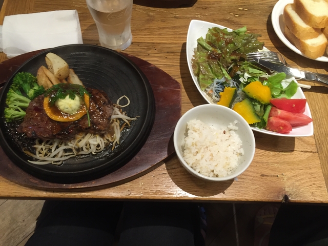 ランチに行きました。デミグラスソースのハンバーグを(^^)サラダバーの種類は豊富で、ライスもパンも食べ放題。値段は1000円くらいとお手頃です。とってもお腹いっぱいになりました♪