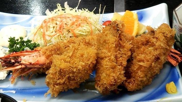 ミックスフライ定食を注文です♪ でっかいカキ3個とでっかいエビフライ(^^) 味噌汁もビックサイズ、マカロニサラダ&キャベツ、松前漬け、漬物が付きます