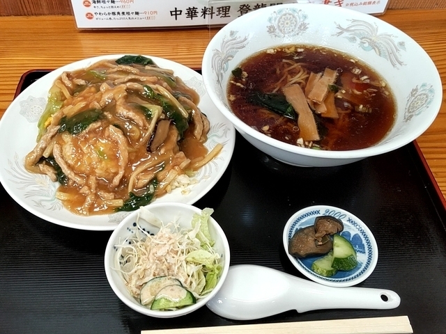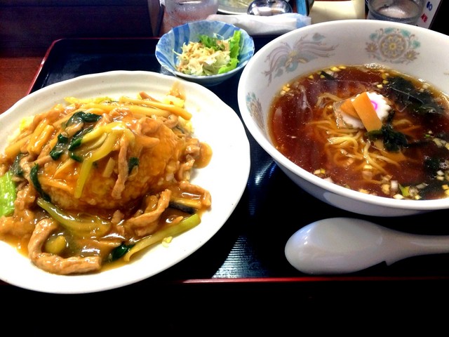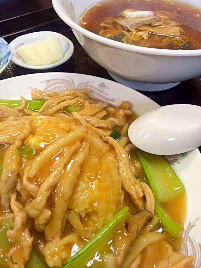 ●千切豚あんかけチャーハン+半ラーメン1,080円 やわらかめのチャーハンに餡がかかり豚の細切りがアクセントになる。 ラーメンは昔ながらの醤油ベース。 メニューが豊富なのでいろいろと試してみたいお店。