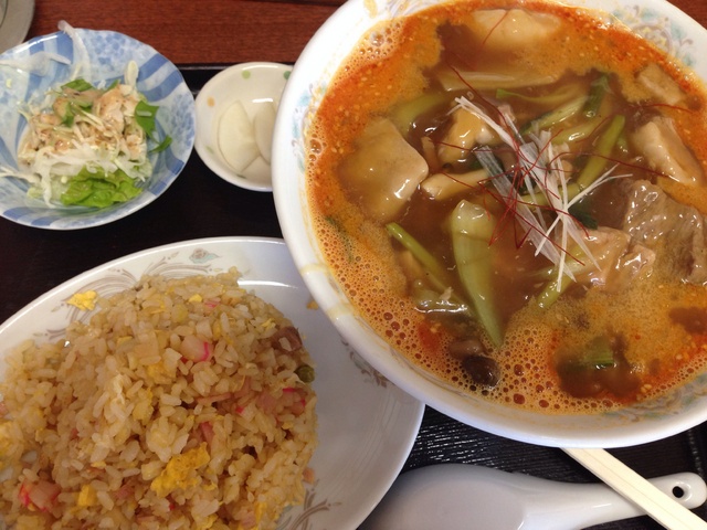 先日、会社の同僚とランチで行きました。 座敷もあるので、子供連れでも安心ですね。 いばナビフライデーでも、話題に出ていた 細切り肉あんかけチャーハンと 半らーめんセットを注文。 絶妙な塩加減のあんかけが 肉とたけのこ・青菜の味を活かして チャーハンとの相性バッチリ! ちょっと味わいを変えたいときには ラー油やコショウを食べるところに チョットかけるのが良いと思います。 ※全部にかけると、全部変わっちゃうので。 量も多めで、満足でしたw 次は、坦々麺を攻めたいと思います。