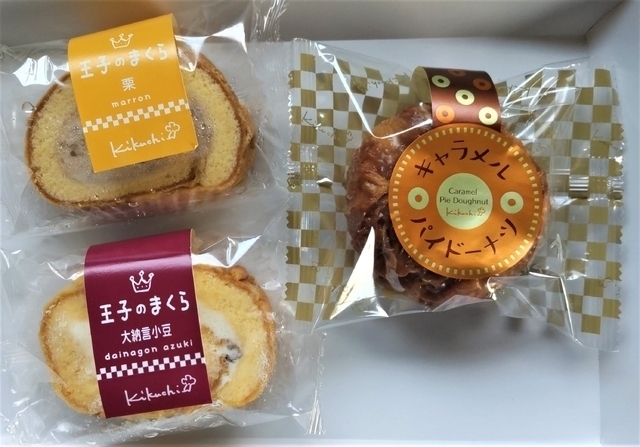 《王子のまくら&キャラメルパイドーナツ》 王子のまくらは、シュー皮付きのロールケーキで、5種類あります。 いろいろな味を楽しめます。冷凍販売で、1つ240円。 キャラメルパイドーナツは、パイ生地にキャラメルをのせて焼いたドーナツです。 1つ200円。10月~4月の期間限定販売商品です。