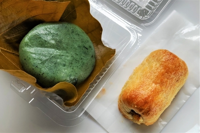 《柏餅&本日焼》 柏餅の季節となり、店頭には3種類の柏餅が並んでいました。 『こし餡』『みそ餡』『草(よもぎ・粒あん)』です。 1つ170円で、パックに入っていたので、今回は草の2個入りを購入しました。 餡を餅で包むという感じではなく、饅頭のようになって柏の葉にくるんでありました。 とても柔らかくしっとりしていておいしかったです。 『本日焼』とは、当日に焼き上がったほっしぃ~ものことで、土曜日限定で購入できます。 価格は同じ1つ180円。生地がサクッとしていて、中の干し芋は柔らかいです。 賞味期間は3日間となります。