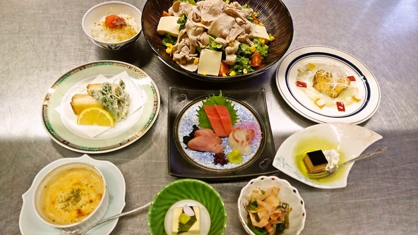 *前菜2品 *豚とお豆腐のしゃぶしゃぶサラダ(梅ドレッシングでお楽しみ下さい^^) *旬の刺身(仕入れによって変わります) *海老真丈のはさみ揚げ *サゴシ(サワラの子ども)のソテー、そらまめのグリーンソースで *鶏肉とたけのこの味噌グラタン *お食事 *デザート 以上9品が楽しめるコースです。素材の味が美味しい、季節料理をお召し上がり下さい。