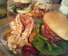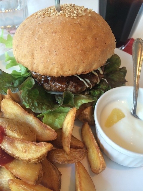 お洒落なアメリカンテイストのお店です。 シンプルなハンバーガーをセット(+100円)で注文したらフライドチキンとドリンクがついてきました。ボリュームたっぷりでしたよ! メニューにはたくさんの種類のハンバーガーと丼系もありました。選ぶのにまよっちゃいます♪ オープンカフェもあってとっても洒落ています。