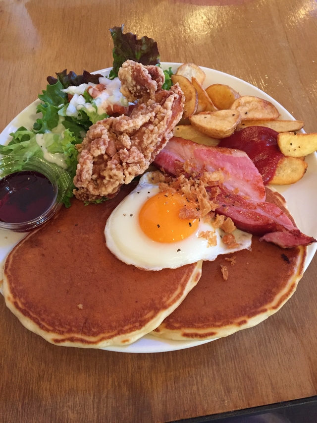 お食事系パンケーキが好きなので、こちらのお店を発見できてテンション上がりました!ベーコンエッグのパンケーキを注文しましたが、期待通り美味しかったです。+100円で注文して、フライドチキンとドリンクもつけてもらったので、お腹いっぱいランチになりました。