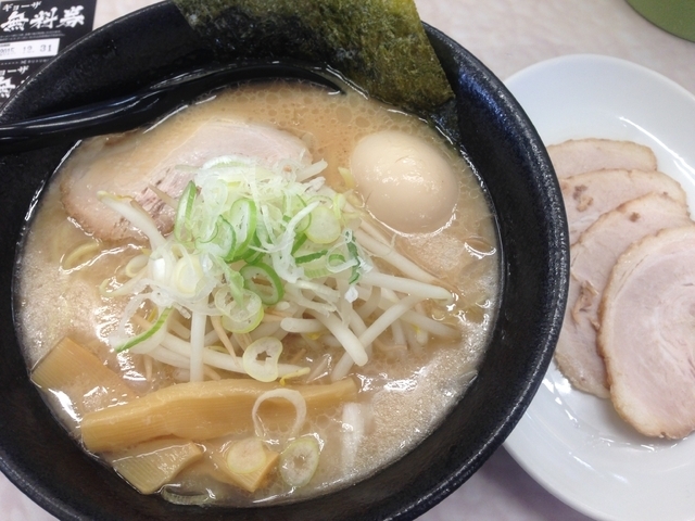 ランチパラダイス特製ねぎ味噌らーめん(ランパラ限定なのに通常価格設定があるのが「?」ですが、そこはご愛嬌か)を食しました。ネギか辛ネギが選べるとのことで、辛ネギ指定。後はやはり麺かため、油・味は普通に。具は辛ネギの他、大きめの豚バラ叉焼3枚、半熟味玉1個、海苔1枚、メンマにもやし。豚骨出汁の味噌スープは旨味が良いです。内容からすると価格的にかなりお得と思いました。また餃子無料券をいただきました。