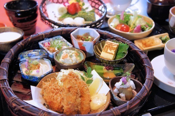 写真は人気の『和膳』。お惣菜の数々と選べるメインの他、選べる〆のデザートが人気のランチメニュー。